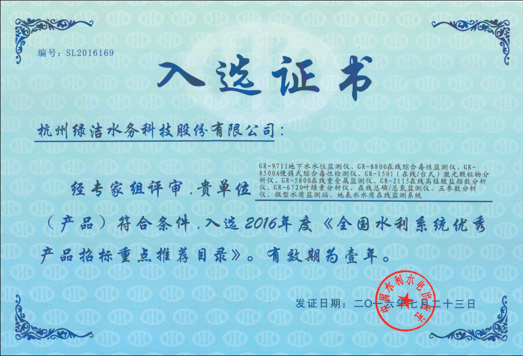 7月,綠潔科技產(chǎn)品再度成功入選《全國水利系統(tǒng)優(yōu)秀產(chǎn)品招標(biāo)重點推薦目錄》?!度珖到y(tǒng)優(yōu)秀產(chǎn)品招標(biāo)重點推薦目錄》每年組織一次優(yōu)秀產(chǎn)品的征集和評選,為各級水利管理機構(gòu)提供選購真實、可靠的水利產(chǎn)品。