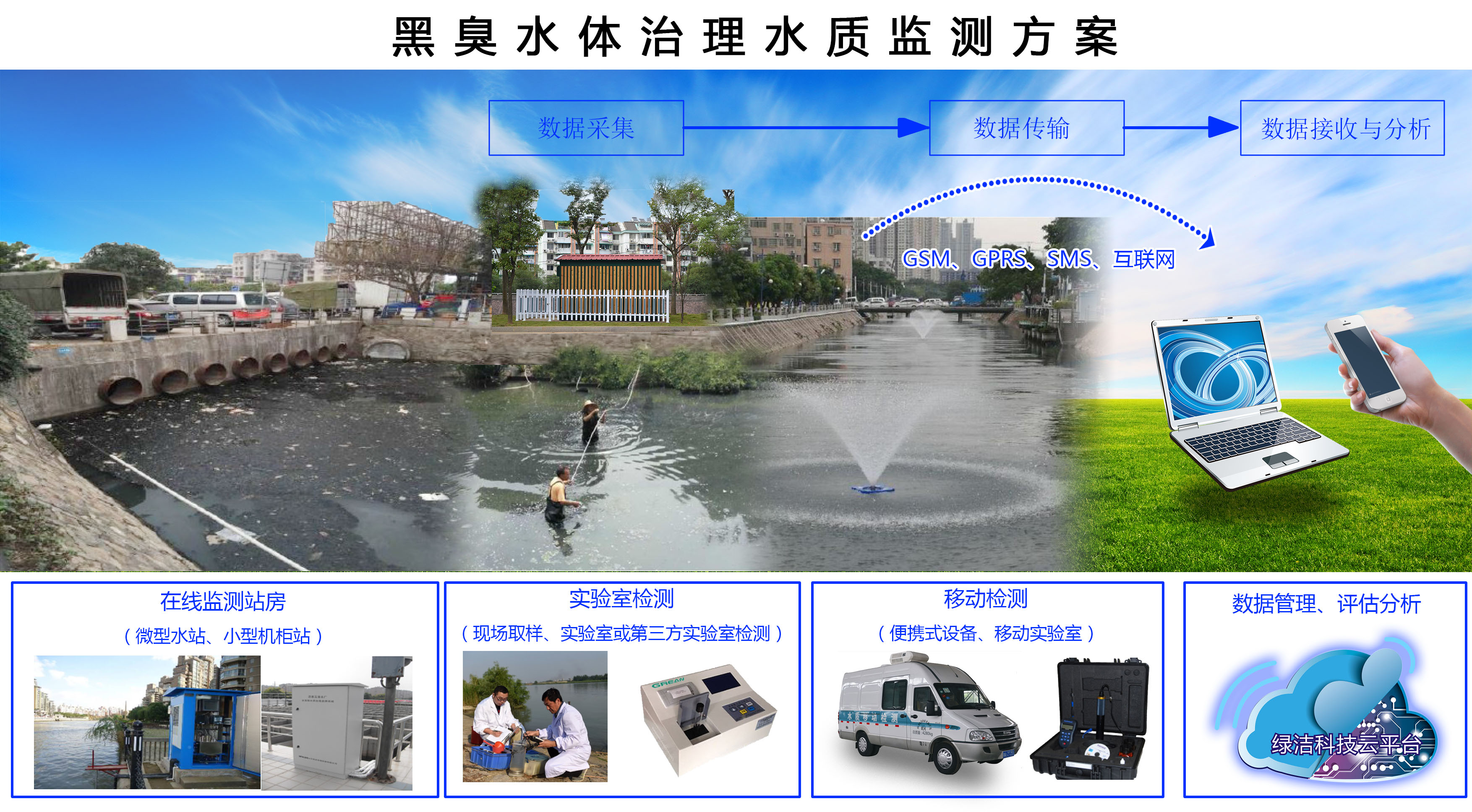 綠潔科技提供黑臭水體治理水質(zhì)監(jiān)測解決方案,分為在線監(jiān)測、實(shí)驗(yàn)室檢測、移動檢測三種。