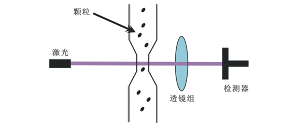 采用激光透射原理,當水樣中的顆粒物通過檢測通道時,入射光束被檢測通道中的粒子遮擋而減弱,光強檢測器產(chǎn)生脈沖信號。脈沖信號的多少反映了粒子的數(shù)量,脈沖信號的大小反映粒子的尺寸。