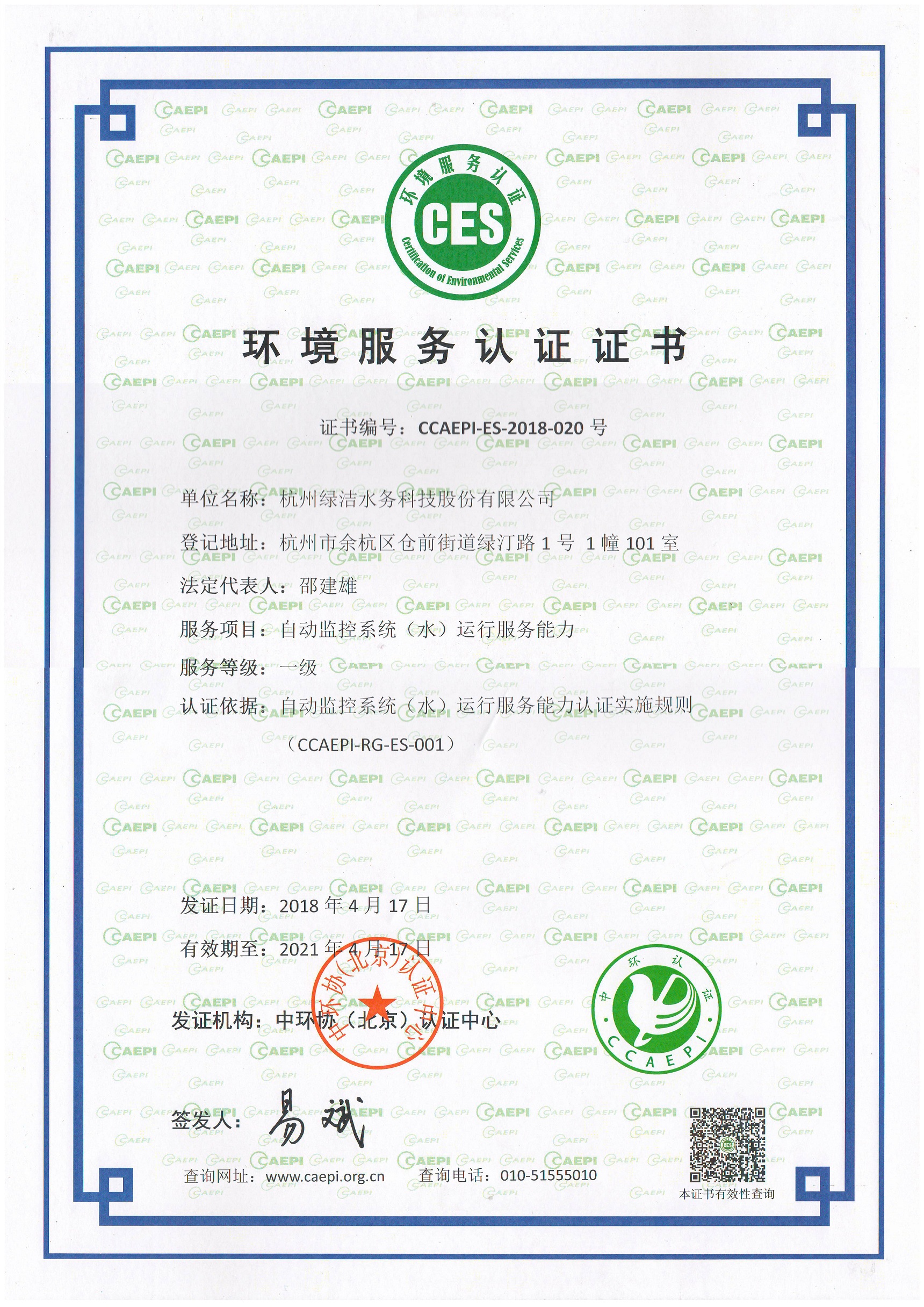 日前,綠潔科技已通過(guò)中國(guó)環(huán)境服務(wù)認(rèn)證,獲得“自動(dòng)監(jiān)控系統(tǒng)(水)運(yùn)行服務(wù)能力”一級(jí)證書(shū)。
